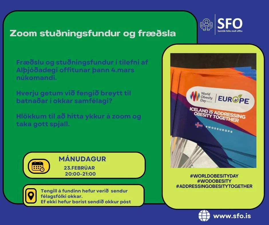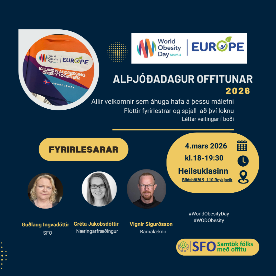 Á alþjóðadegi offitunar þann 4. mars n.k. verður aðalfundur SFO - Samtaka fólks með offitu haldinn klukkan 17:00-17:45 í sal hjá Heilsuklasanum, Bíldshöfða 9